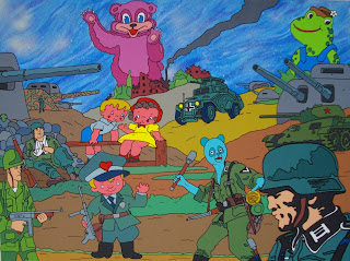 Its world war two vs cute little figures from cards and books for young children, but whats really going on is that Im trying totell you about how people take the good with the bad. So, even if there is a big war going on, you might have a good day here and there. Its also about how something bad can happen on a normal to great day. One moment its all about puppylove and a funny song and the next someone might come rushing in and tell you to turn on the news and it will be all bad from there. But its not just about those things and the way of the world, its also about how much I love to draw war. Its one of the first things i drew as a child and it wont go away any time soon. Drawing some cool tanks makes my day.